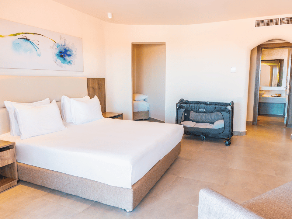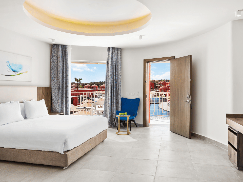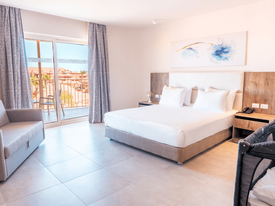 Kétágyas deluxe szoba kertre néző kb. 55 nm , felár ellenében foglalható medencére néző kilátással is.