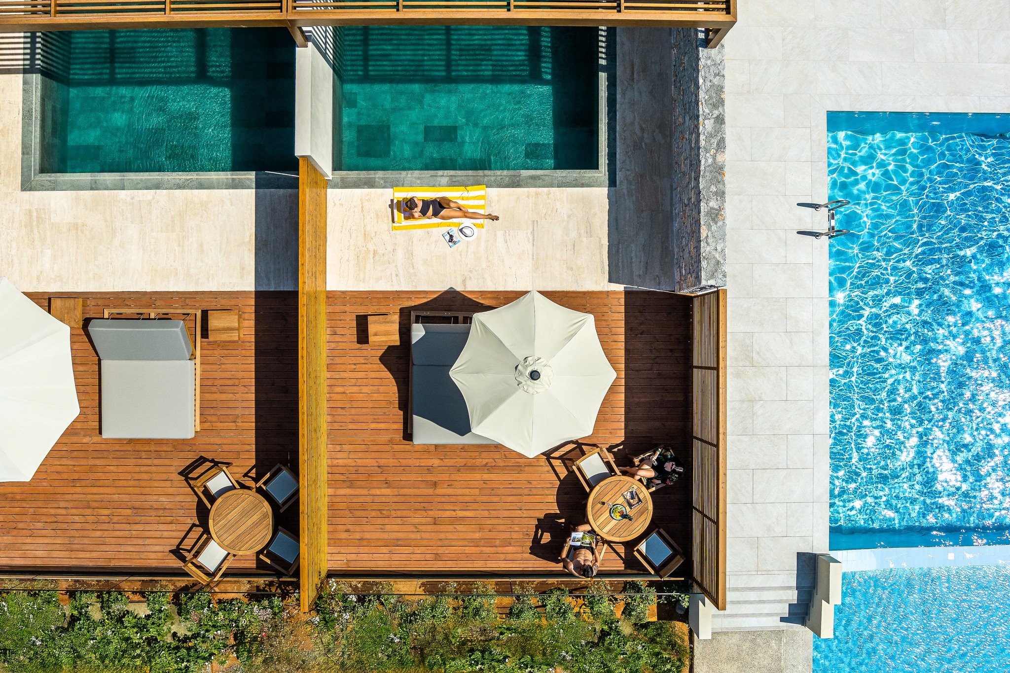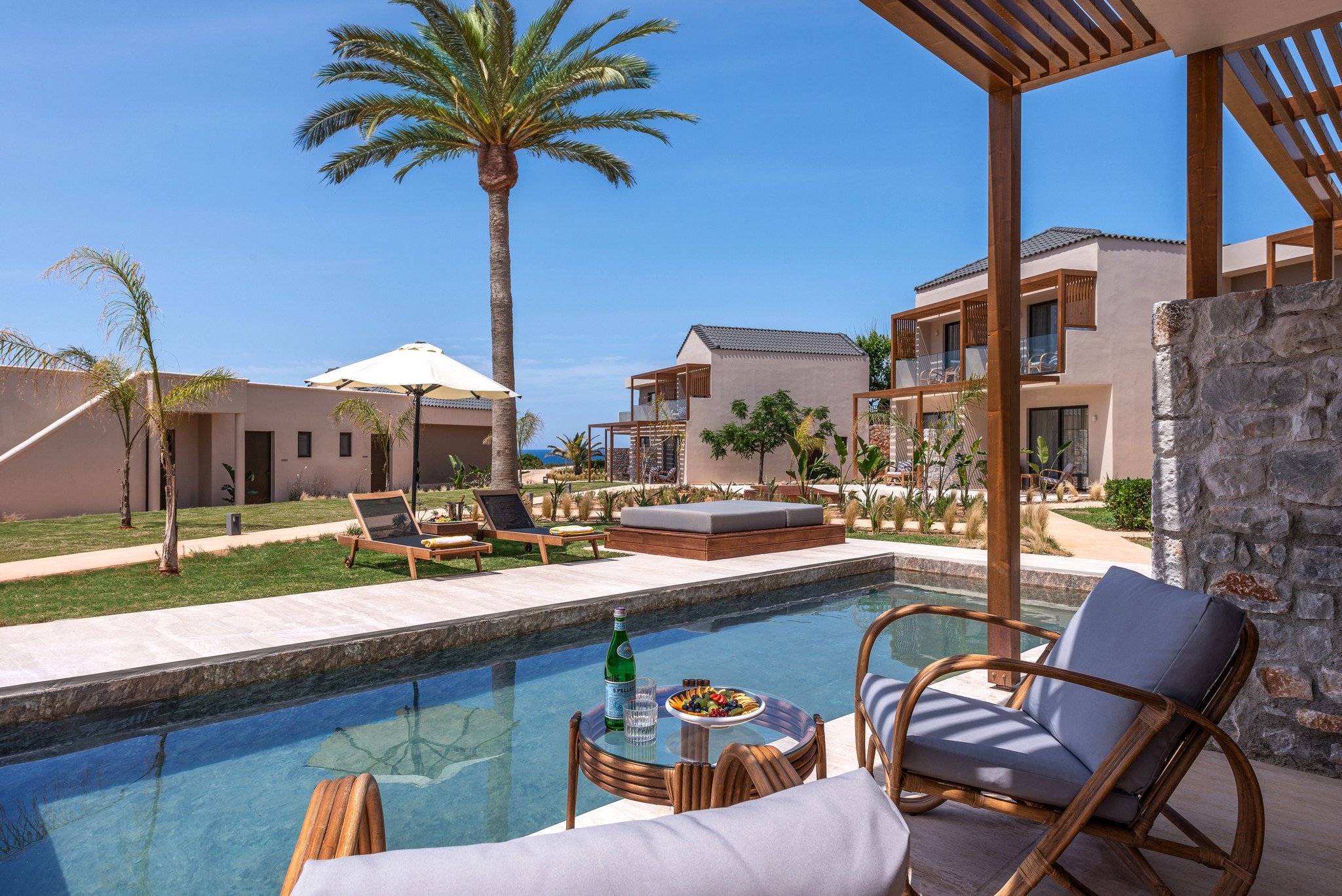 - Grande-suitek - egy nagy szoba, tágasabbak, a főépületben, a teraszról közvetlen kijárat a külön közös medencéhez, tengerre nézők