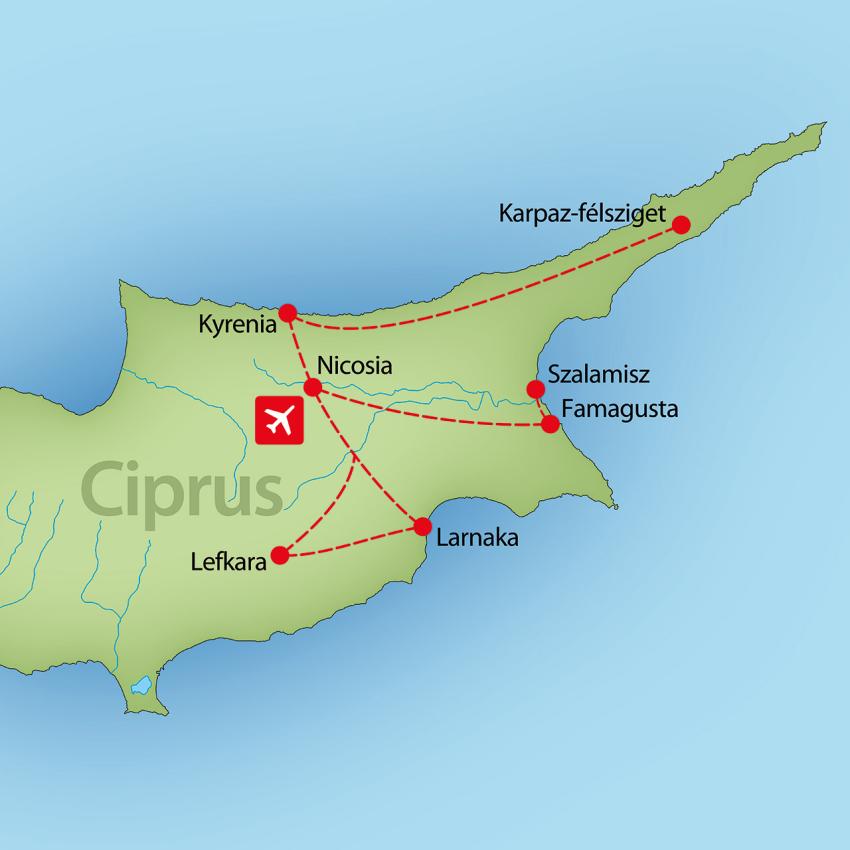 Fedezze fel Ciprus mítoszokkal átszőtt világát, történelmi városait és lenyűgöző természeti kincseit ezen a 8 napos, magyar idegenvezetéses körutazáson. A program során bejárjuk Famagusta óvárosát, Nikosia kettéosztott fővárosát, Szalamisz ókori romjait, a festői Kyreniát és akár a különleges Karpaz-félszigetet is. Tartalmas városnézések, mediterrán hangulat és életre szóló élmények várják.