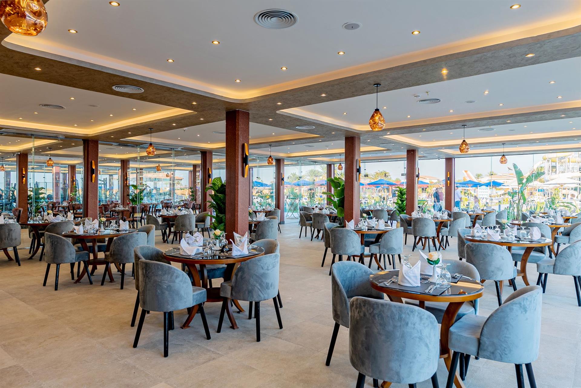 - Tágas szobák (42–85 m²), swim-up és royal lakosztályokkal