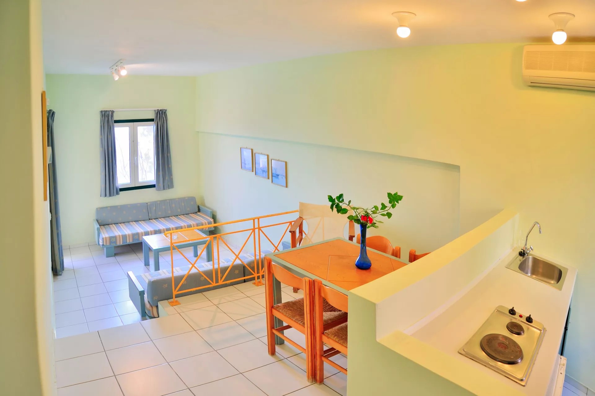 - 2 hálószobás, tenger felé néző apartmanokban, melyek felszereltségükben megegyeznek az 1 hálószobás apartmanokkal, de 2 szintesek. Az egyik szinten található a nappali/konya rész, a másik szinten pedig 2 külön hálószoba és 1 fürdőszoba.