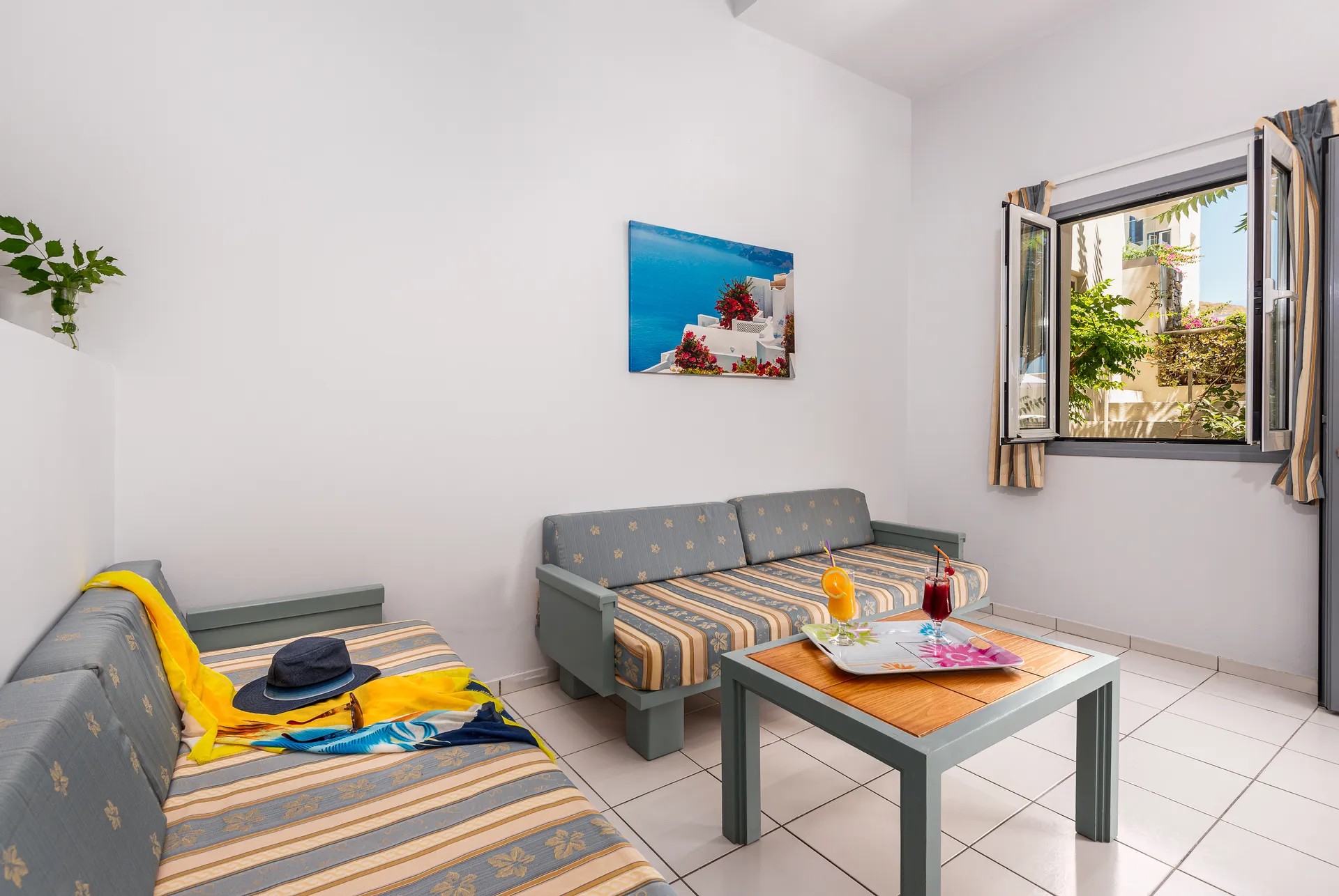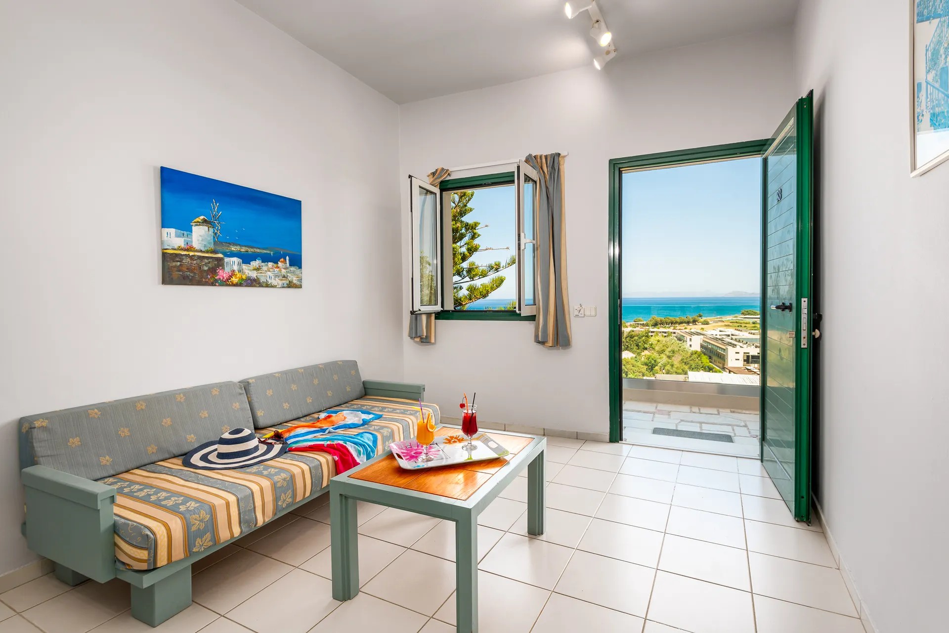 - 1 hálószobás, tenger felé néző apartmanokban, melyek 1 nappali/konyha részből és 1 hálószobából állnak. A nappaliban 1 szófa, a hálószobában 1 franciaágy vagy twin ágy találhatóak. Felszereltségükhöz sat TV, kávéfőzési lehetőség, hajszárító, légkondicionáló, minihűtő, balkon/terasz, széf és ingyenes WIFI tartozik.