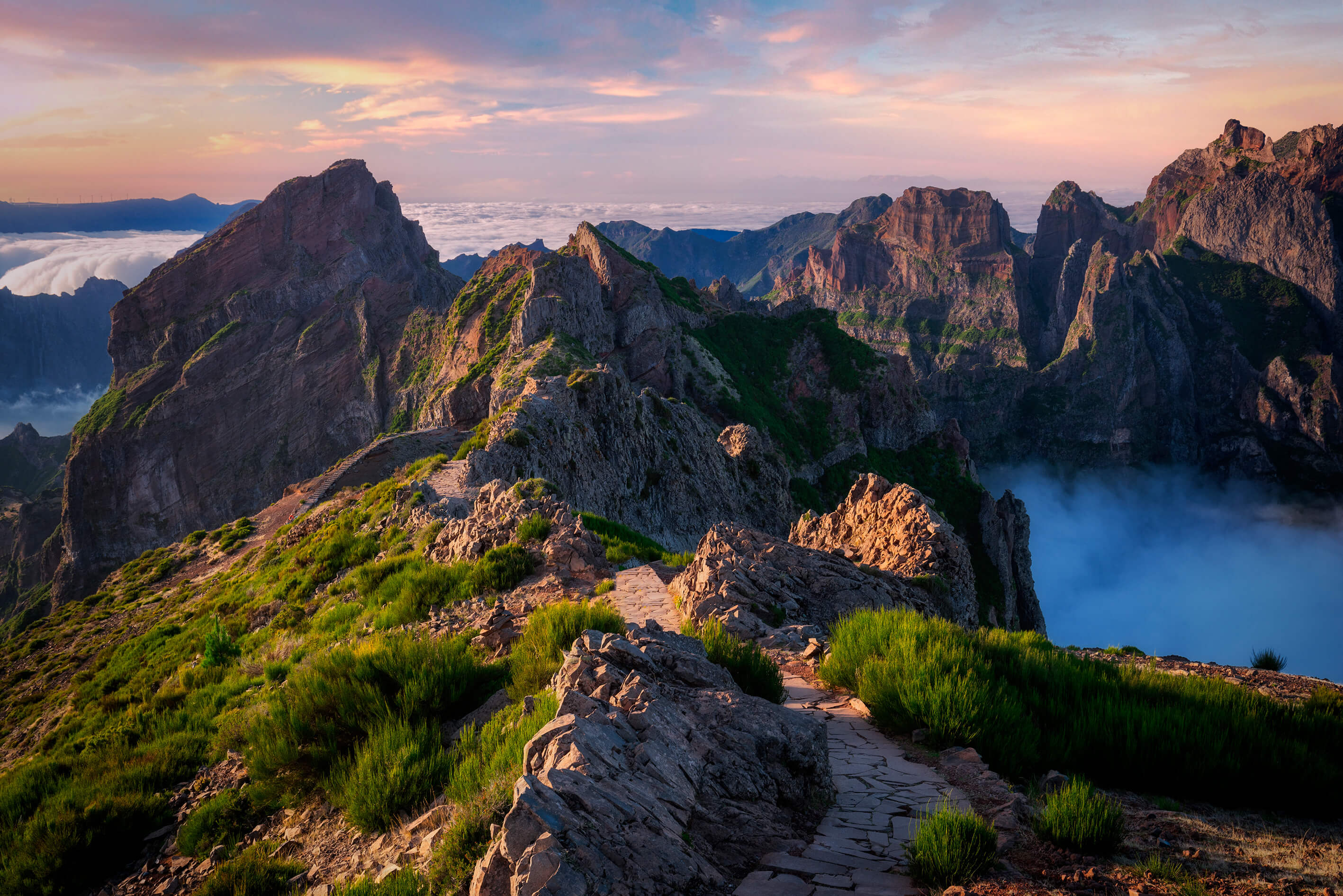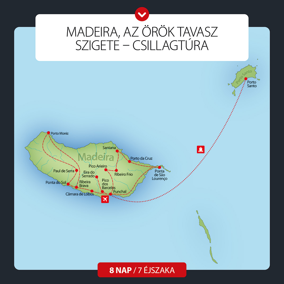 A napunknak látványos kezdést biztosít a sziget egyik legmagasabb pontja, a Pico Arieiro, mely 1818 méter magas. Innen álomszép kilátás nyílik a környező, zöldellő lankákra, és a sejtelmes felhőkre. Tiszta időben akár a Paul de Serra fennsíkon lévő szélturbinákat is megpillanthatjuk, Innen a Ribeiro Frio völgyben a laurissilva, azaz babérerdő vár ránk. Megállunk egy kis levada túrára. A levada egy tipikus madeirai turistaútvonal, mely a növények ellátását biztosító vízicsatornák köré épültek. Körülbelül 25 perces ballagás után érjük el a Balcões kilátópontot. A buszunkhoz visszafelé egy újabb, kb. 20 perces gyaloglás vezet. Majd Santana varázsol el minket jellegzetes, háromszöget formázó kis faházaival. Majd elhaladunk Porto da Cruz, illetve a sziget jelképének számító Sasszikla, azaz Penha D’Águia mellett. Kihagyhatatlan élményt ígér a rumfőzde Engenhos do Norte-nál. A nap méltó zárását jelenti Ponta S. Lourenco, Madeira legkeletibb pontja, ahonnan elénk tárul az északi és a déli part is. Visszatérés a hotelbe.