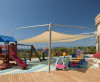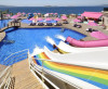- több medence (ez egyik csúszdákkal, az egyik tengervizes), napágyak, napernyők és törölközők ingyenesen