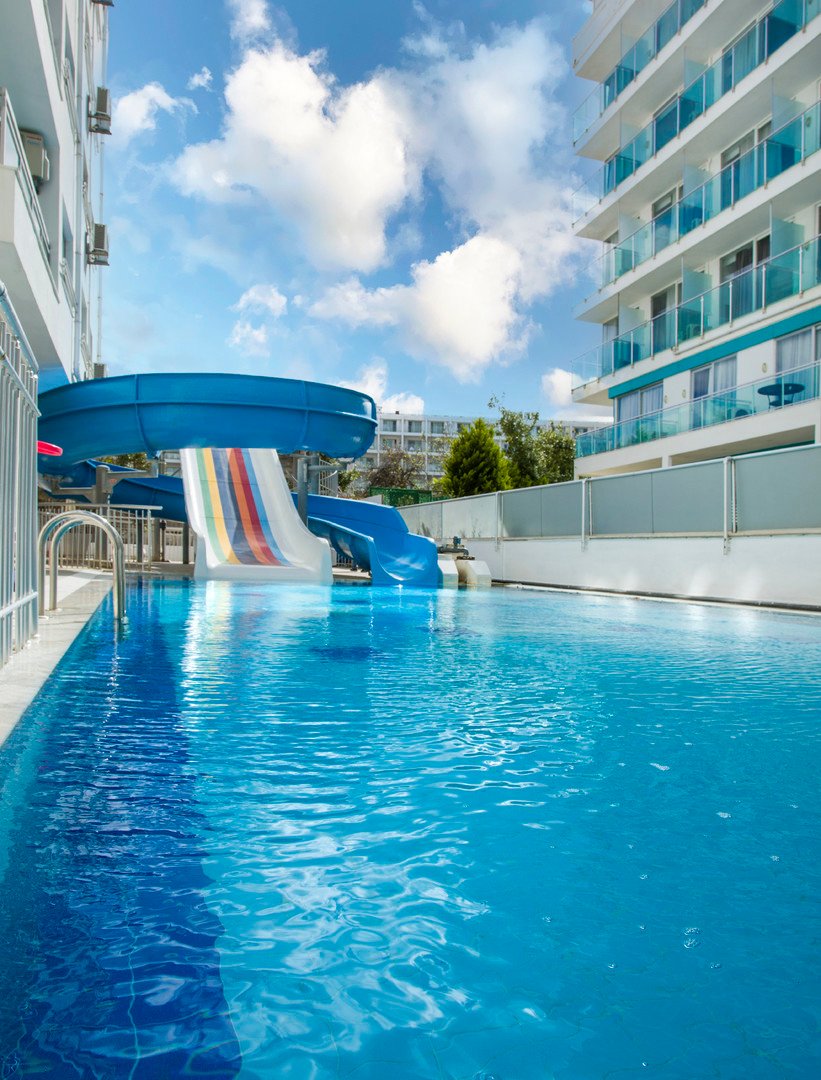 medence 2 csúszdával - kb. 113 m2, mélység: kb. 1,6 m